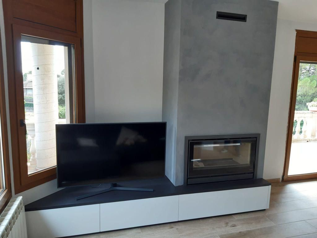 Llar de foc amb llenyer, TV empotrada i llums led.